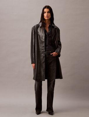 Crafted from premium leather, this coat is a sleek option to style towards immaculate outfits. Designed with long sleeves and a point collar. Detailed with concealed buttons with one left visible at the top.