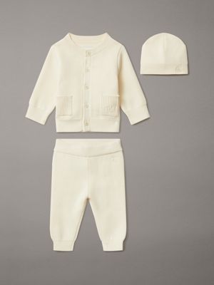 • 3-piece set: cardigan jumper, trousers and hat